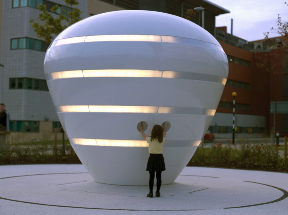 The sculpture becomes animated through the presence and action of people in varied and changeable ways. A hospital is more than just a building: it is a living machine and a machine for living. The work alludes to the simple, precious and fascinating commonality of the heartbeat.
