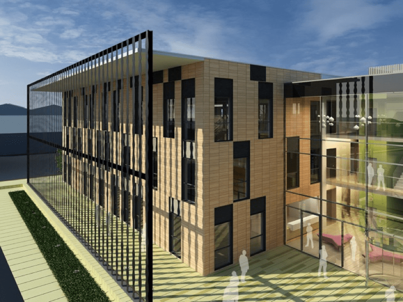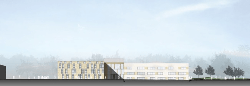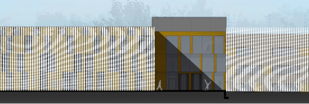 The image as a whole works as a half tone pattern, appearing abstract when close up and becoming recognisable as a wood grain pattern from a distance. The image had to conform as a whole to the required light levels, allowing 60% light through over its whole area. (The original buildings front elevation area dimensions being 95m x 15m. Drawing below not to scale) This image is 60% black to 40% white. The white represents the Brise soleil. The black the gaps. Each slat is 300mm wide with a gap of 300mm the thinest part of the shaped slats drops to approx 160mm wide. The whole scheme was at the final planning stage before being cancelled due to financial cuts in 2011.