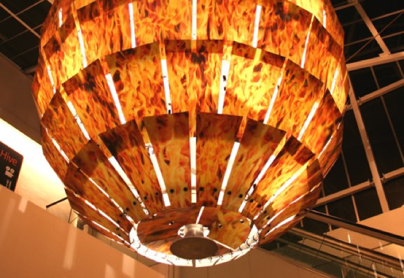 The lenticular panels hold images of fire which alternately animate on the horizontal and vertical axis, enabling 3D effects and animations when travelling up and down the two diagonal escalators, spatially defining two boundaries and one of the entrances into this connecting atrium.