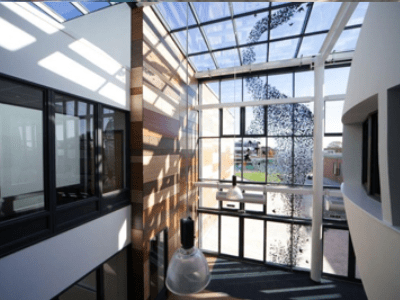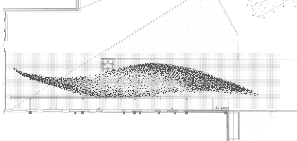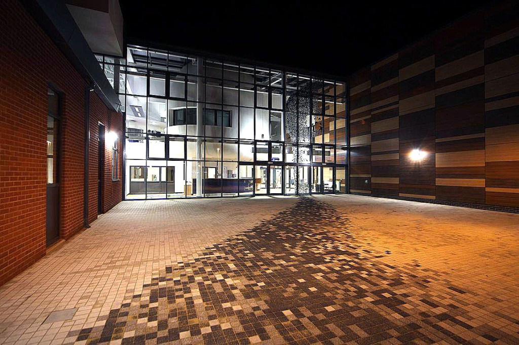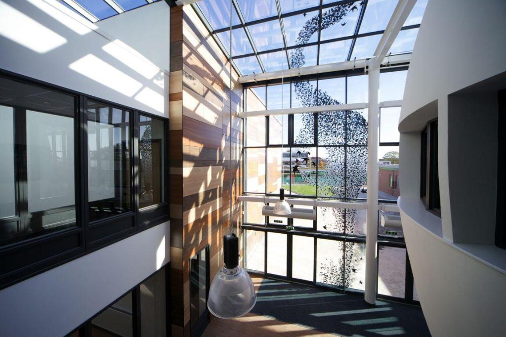 In the pathway leading to the main entrance, a murmuration design utilises three tonnes of block sets to create the the overall effect. The pattern will appear random when standing on it but reveals depth and order from various vistas. Murmuration of flocking starlings is a common sight on the nearby Somerset Levels. As vinyl and block set designs, they continue from the floor, up and over the front glass elevation in pixilated vinyl patterns, the manifestation throwing shadows on the internal dome.