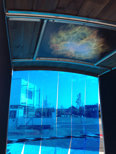 The pods contain ceiling lenticulars. (3D hubble images), different lenticular images are set within the roof and along with the PVC curtains, create blocks of colour washing within.