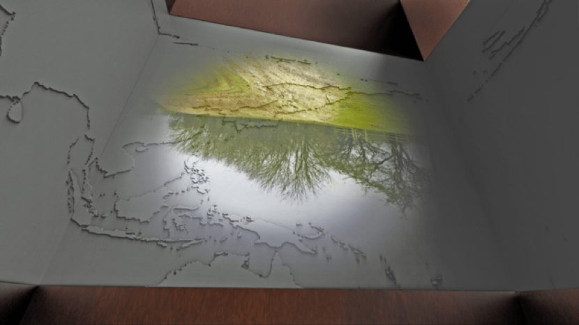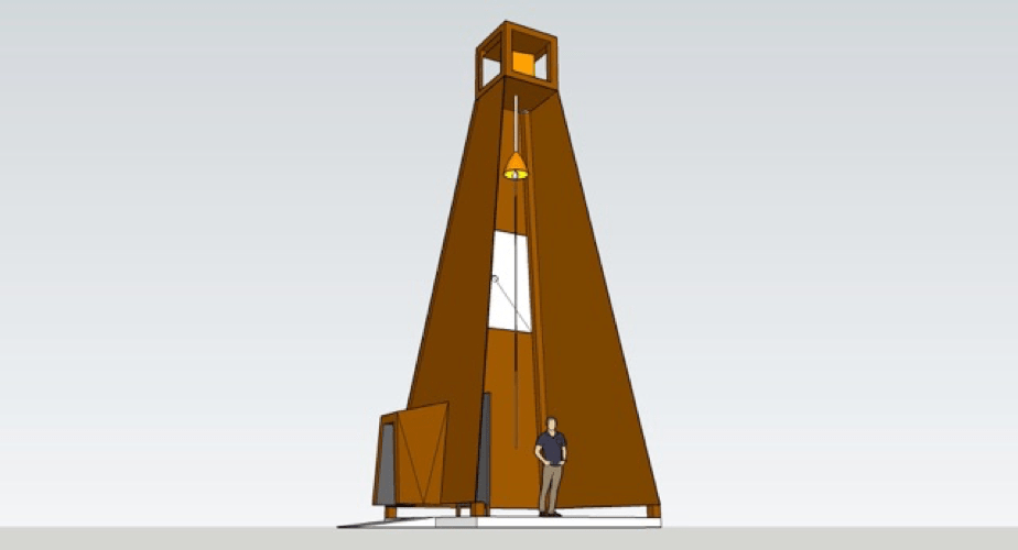 (Main structure fabricated in Corten steel, with a stone and metal inlay floor, the bell and wedge vane, brass, the white wrap around internal projection screen, photo etched concrete.)