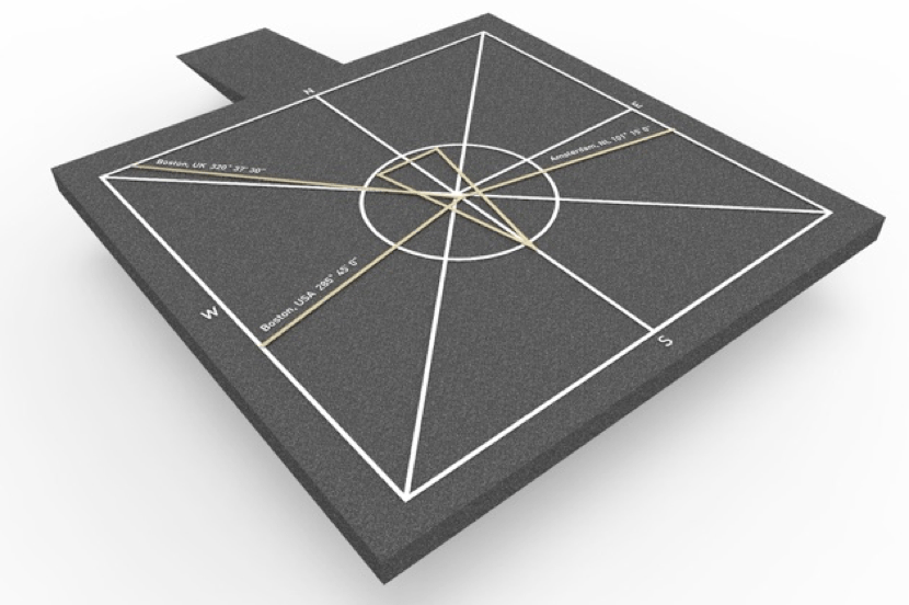 A faceted and polished wedged beacon form will catch the rising and setting sun reflecting light metaphorically and literally directly back to Amsterdam and Boston, the reflected light visible from distance across the flat plains.