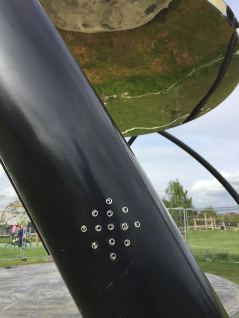The sun disk element can be seen from all aspects of the park, acting as a hub or rendezvous from which lines can be drawn out to local key sites, the centre of a compass that radiates out to the surrounding areas. Perform and be entertained, a place for talent to be discovered, a shelter from the rain, an outdoor classroom, an interactive space, and a spotlight. Perforated grommets set into the tubes create a whispering gallery, enabling people to talk into one side of a tube and be heard from the opposite side.