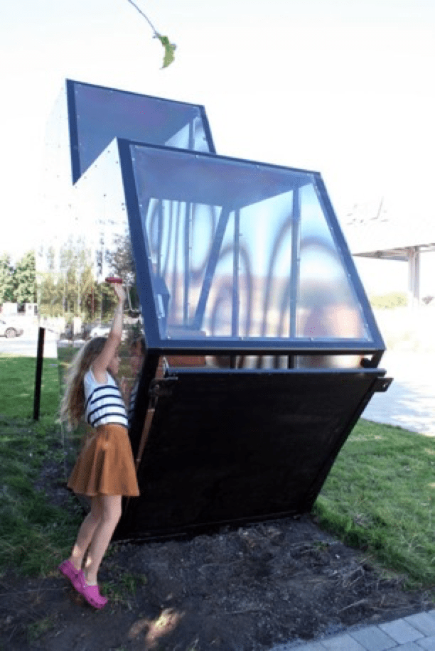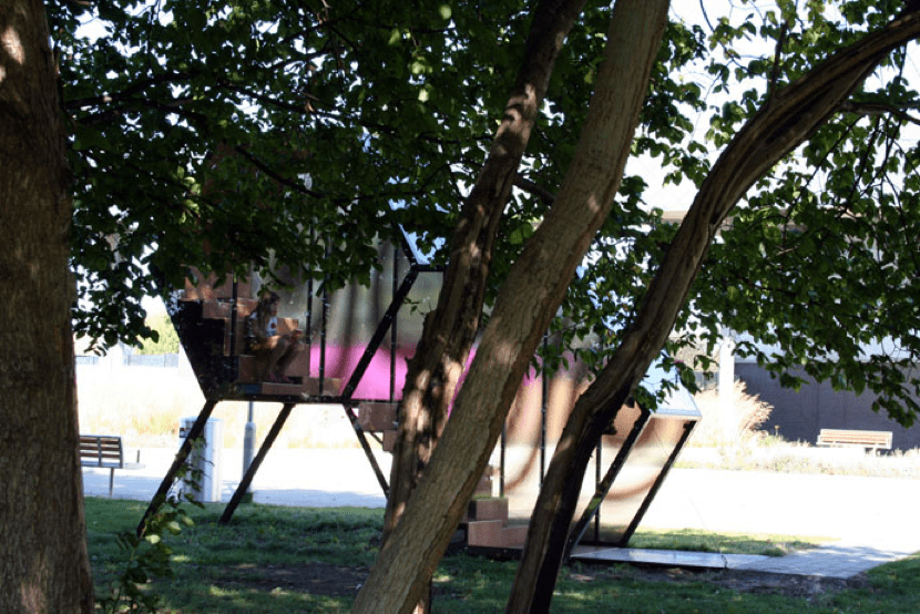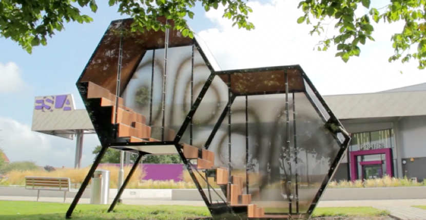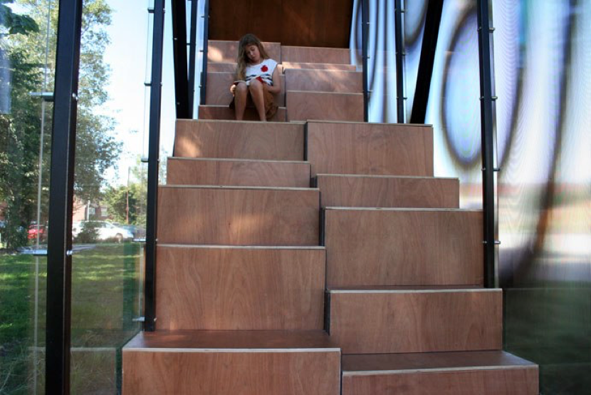 The steel, timber and polycarbonate structure, can be accessed by students for quite reflection or reading time. The surface facing the main pathway has double sided printing which creates a moire effect when passed by or entered.